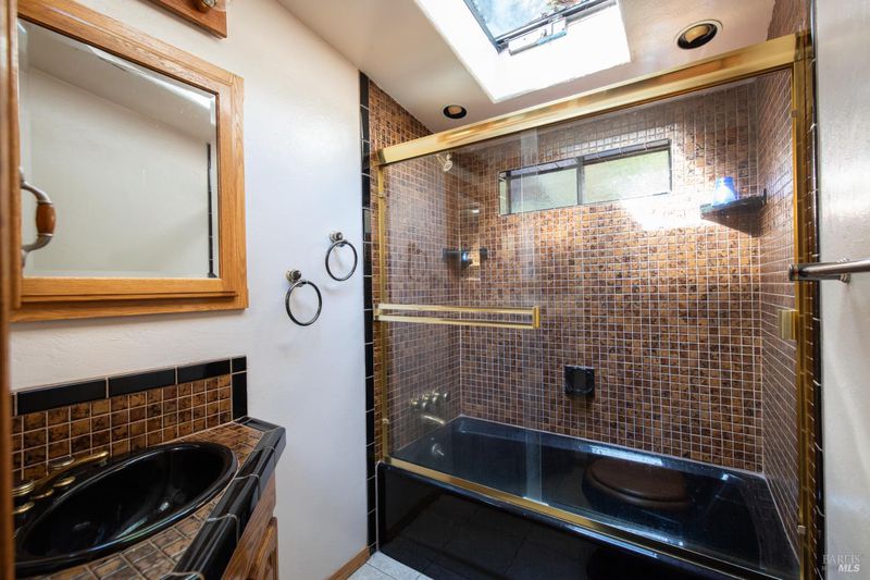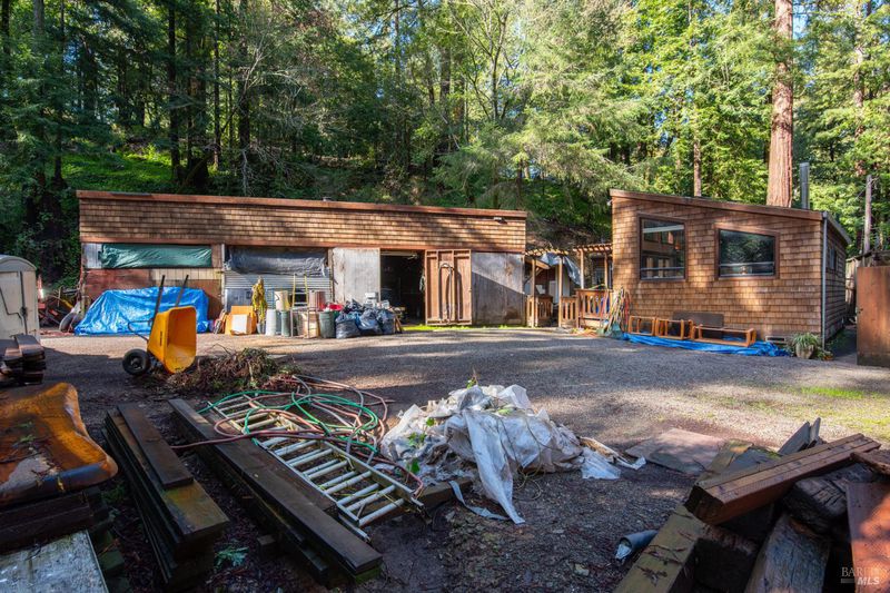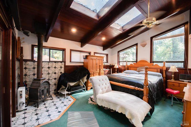 Great single-story 2-bedroom, 2 bath home featuring semi-modern kitchen, nice master bedroom with vaulted ceiling, clear heart wood open-beam ceilings, wood-burning fireplace and master bathroom with Maple wood-inlaid walls, sunken jacuzzi spa with antique lead-stained glass window, double sinks. Inside washer and dryer hookups. The home acts like it has two separate master bedroom suites on opposite sides of the house. There is a 968 sq. foot. 4-car garage and large, useable yard: perfect for a car enthusiast. A second lot is included in the asking price and allows for RV parking, behind and above the home, on Austin Creek Rd, AP# 105-160-006. There is a 130 sq. foot shed in the back that was converted to a sound room for musical instruments, lighting is way cool. Swimming in Austin Creek right across the road near the bridge. About two miles from the quaint town of Cazadero, only 15 minutes to Safeway in Guerneville. Golfing is even closer.