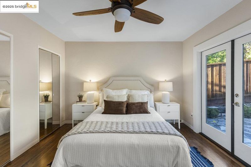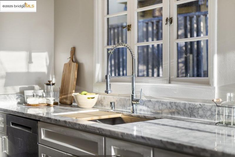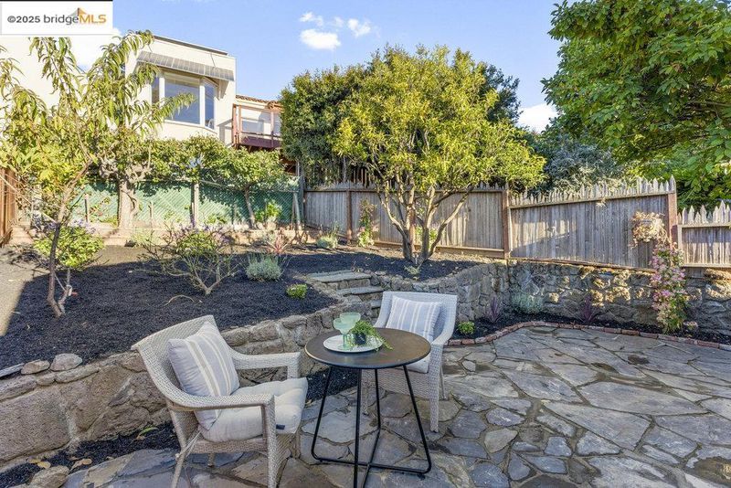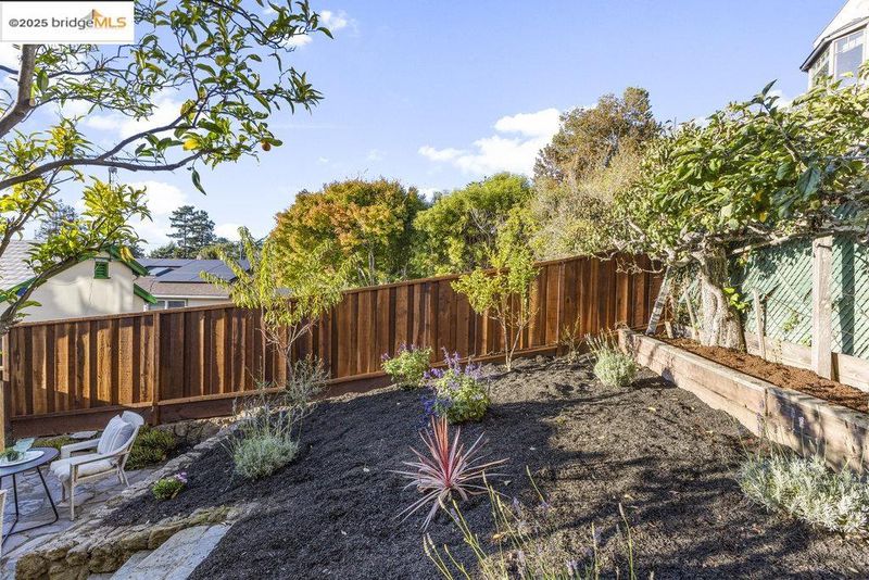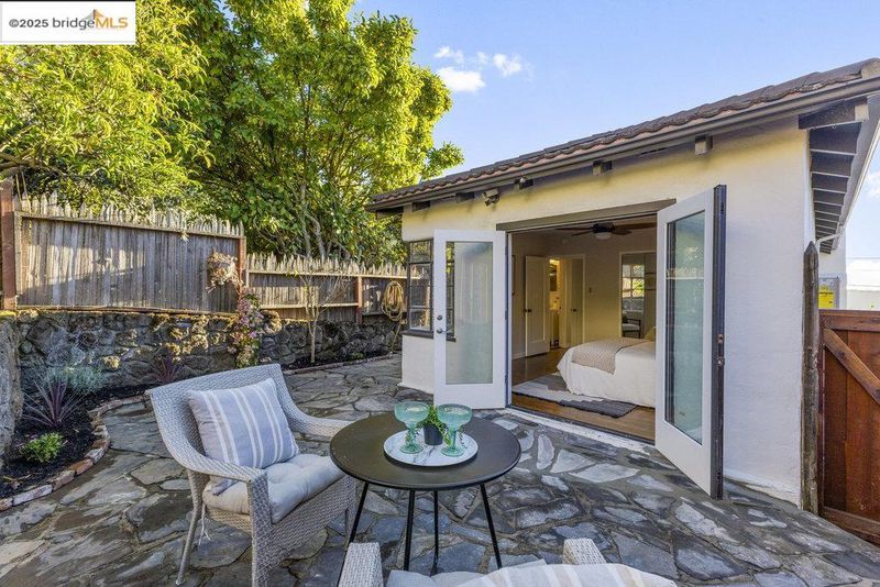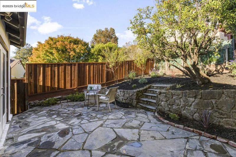 Welcome to a timeless 1938 Craftsman retreat with stunning Bay and San Francisco skyline views! This single-level home offers thoughtfully designed living spaces with an idyllic yard. Refinished hardwood floors, a stone fireplace, and an open layout connect the living, dining, and updated kitchen. Enjoy the kitchen's Carrara marble counters, Shaker cabinets, and stainless appliances. A dedicated pantry prep area with sink, making cooking a joy for the home chef who values form, efficiency, and the space to share cooking with others. The serene primary suite features French doors that open to the backyard patio. A versatile bonus garage room offers space for a gym, workshop, or studio, plus dedicated laundry and interior access. Large flat yard space with slate hardscape patio and a large terrace planting area makes the outside spaces perfect for evening dining, afternoon BBQs, or peaceful relaxation among fruit trees. Updated systems include a new floor furnace and tankless water heater. Enjoy a one-car garage, two off-street spaces, and easy access to Kensington and Berkeley restaurants, shops, Tilden Park trails and transportation.