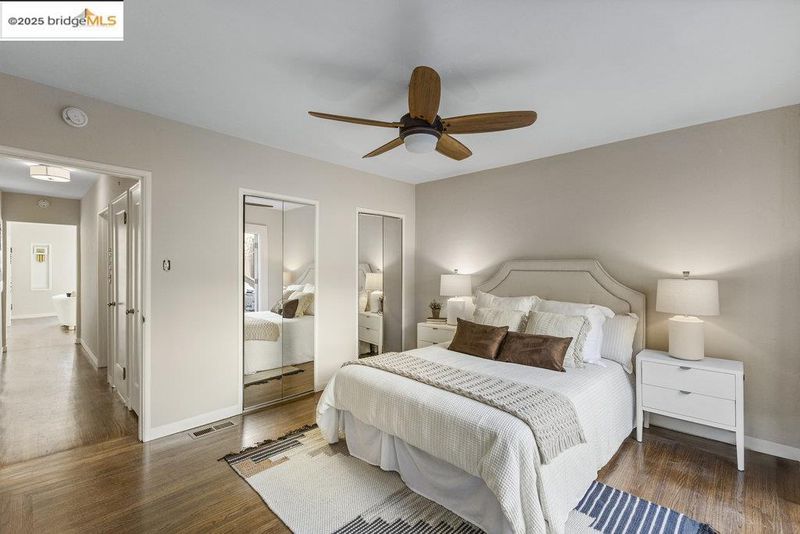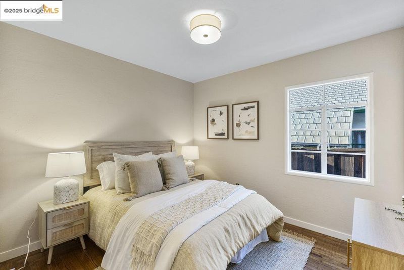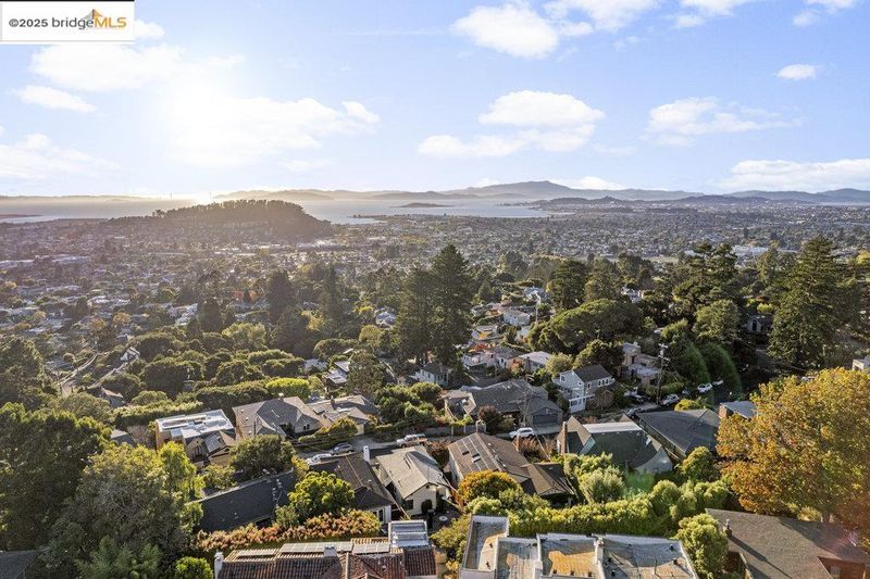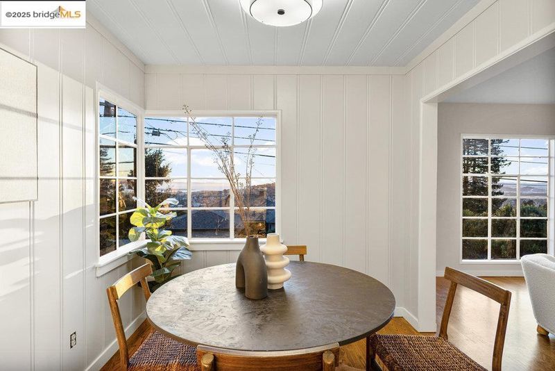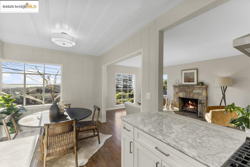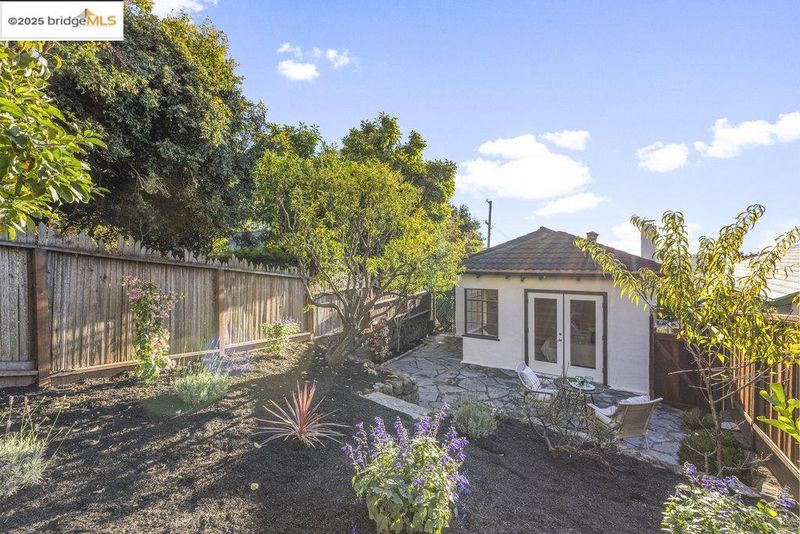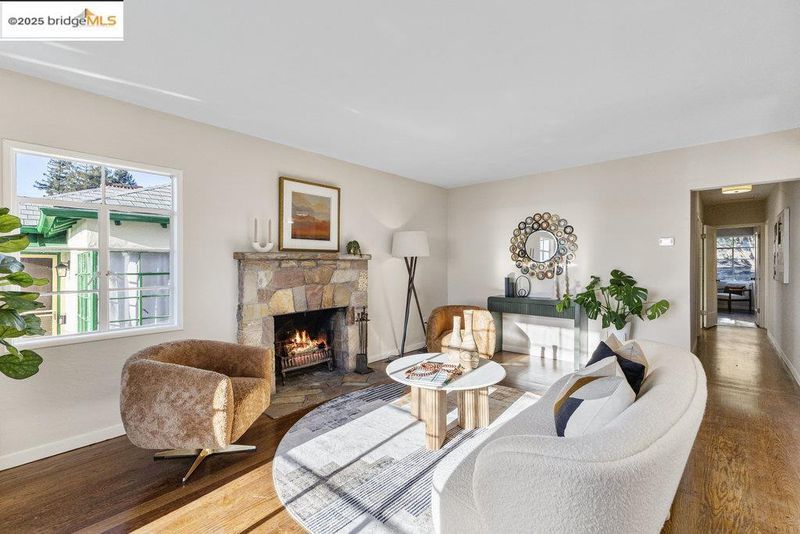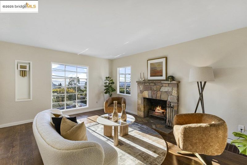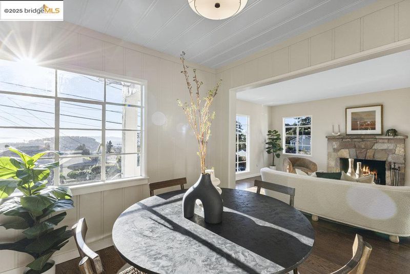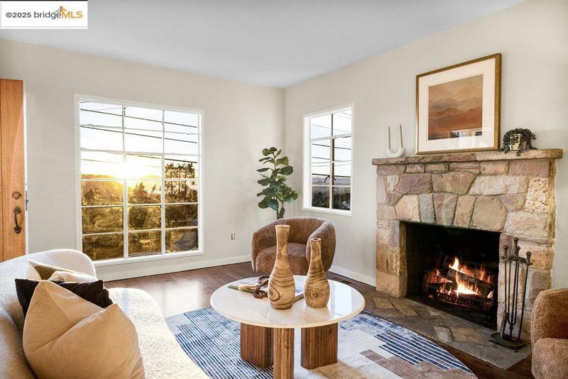 Welcome to a timeless 1938 Craftsman retreat with stunning Bay and San Francisco skyline views! This single-level home offers thoughtfully designed living spaces with an idyllic yard. Refinished hardwood floors, a stone fireplace, and an open layout connect the living, dining, and updated kitchen. Enjoy the kitchen's Carrara marble counters, Shaker cabinets, and stainless appliances. A dedicated pantry prep area with sink, making cooking a joy for the home chef who values form, efficiency, and the space to share cooking with others. The serene primary suite features French doors that open to the backyard patio. A versatile bonus garage room offers space for a gym, workshop, or studio, plus dedicated laundry and interior access. Large flat yard space with slate hardscape patio and a large terrace planting area makes the outside spaces perfect for evening dining, afternoon BBQs, or peaceful relaxation among fruit trees. Updated systems include a new floor furnace and tankless water heater.