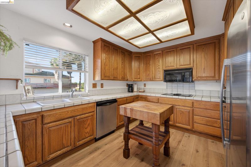 - Dishwasher, Electric Range, Oven, Refrigerator, Dryer, Washer, Gas Water Heater, 220 Volt Outlet, Breakfast Bar, Tile Counters, Electric Range/Cooktop, Disposal, Oven Built-in