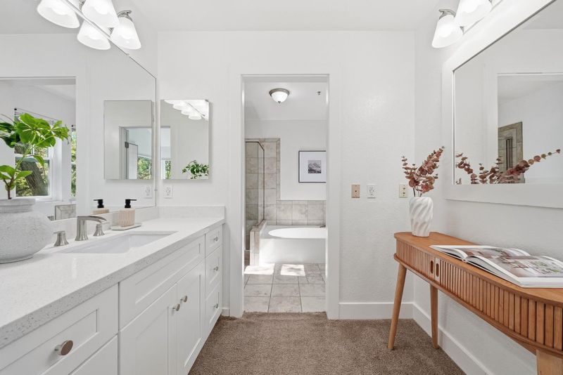 - Double Sinks, Half on Ground Floor, Primary - Oversized Tub, Primary - Stall Shower(s), Shower over Tub - 1, Stall Shower, Tile, Tub in Primary Bedroom, Updated Bath