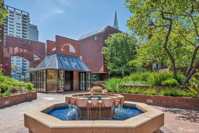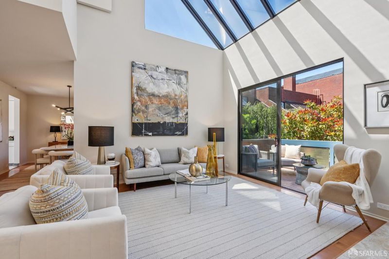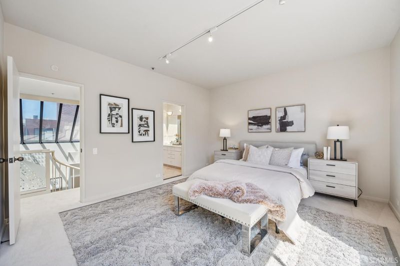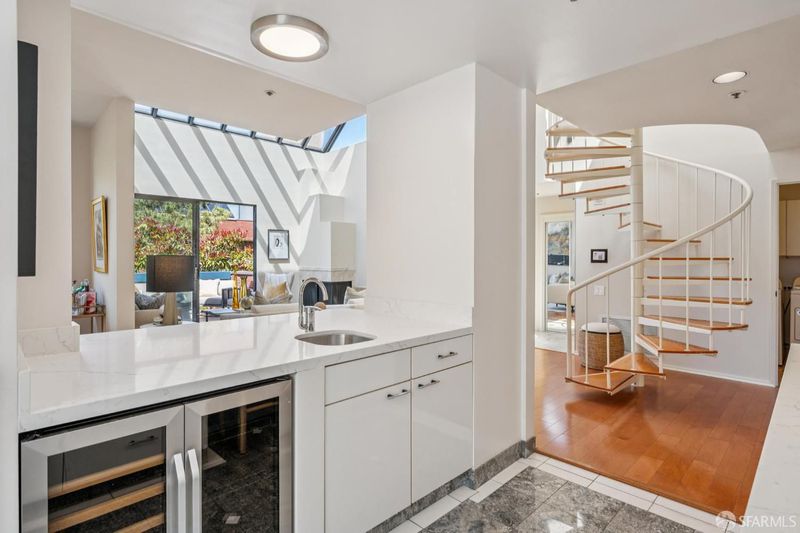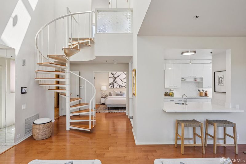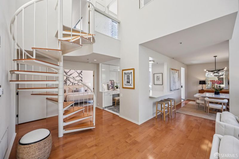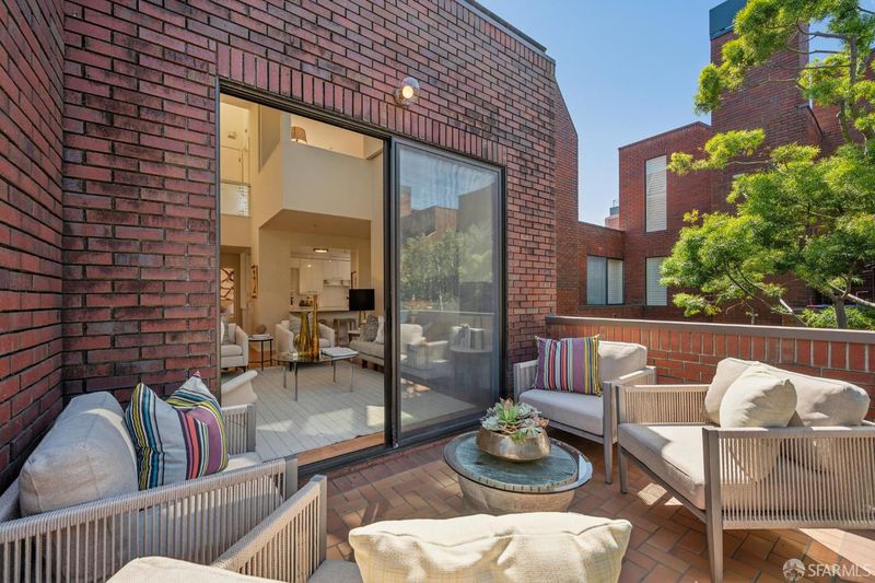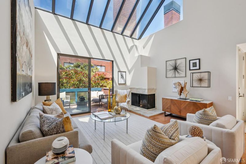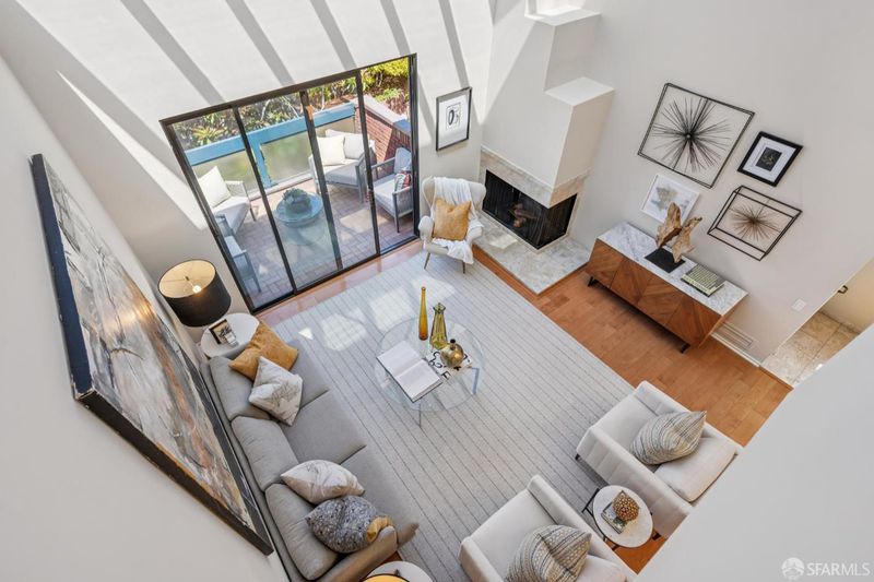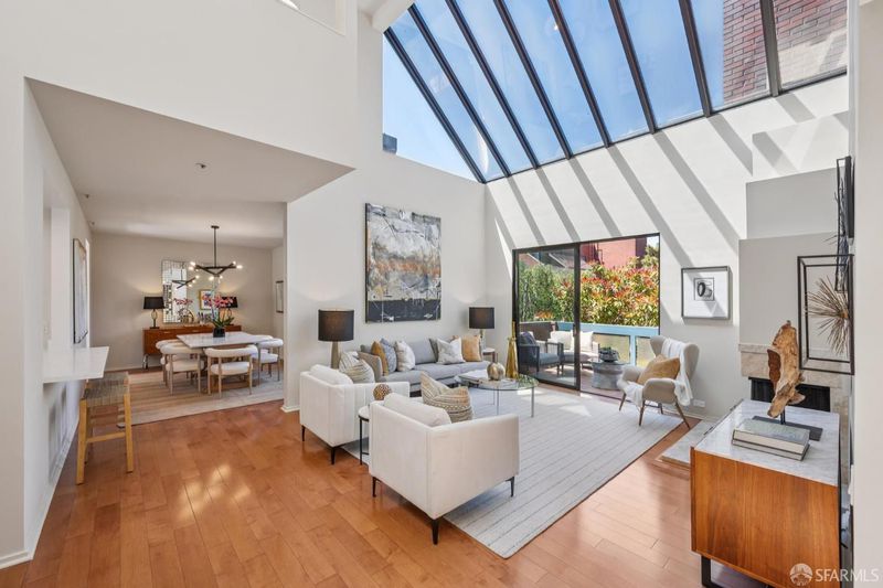 Modern, house-like condominium offering 1,993 square feet across two levels in the coveted Golden Gateway Commons. A tranquil courtyard setting provides a welcoming entry to the main level, anchored by a dramatic living room with 17-foot vaulted glass ceilings, wood-burning corner fireplace and sliding glass doors opening to a generous private deck. The open layout connects easily to the dining area and an updated Euro-style kitchen with marble countertops, wine chiller, and wet bar. A well-located bedroom, full bath with steam shower, and separate laundry room are also on this level, finished with hardwood and stone tile floors throughout. A contemporary spiral staircase leads to the upper level, where two en-suite bedrooms offer separation and privacy. The primary suite serves as a quiet retreat with a spa-like bath, walk-in closet, south-facing patio, and expansive windows overlooking the courtyard and living space below. A second en-suite bedroom completes the upper level and enjoys peaceful downtown outlooks. Well located near Kokkari Estiatorio, Bay Club San Francisco, Safeway, the Ferry Building Marketplace, the Embarcadero, Financial District, and Sydney G. Walton Square. One-car parking.