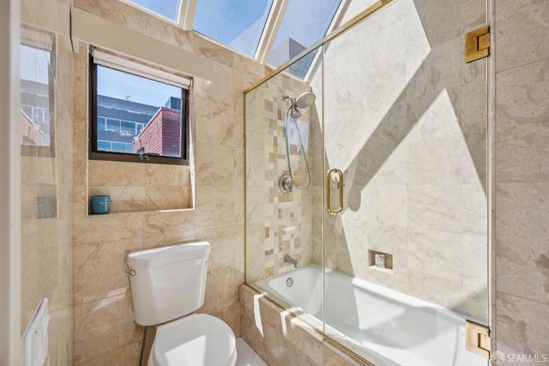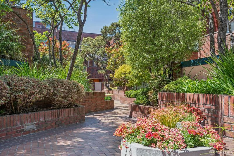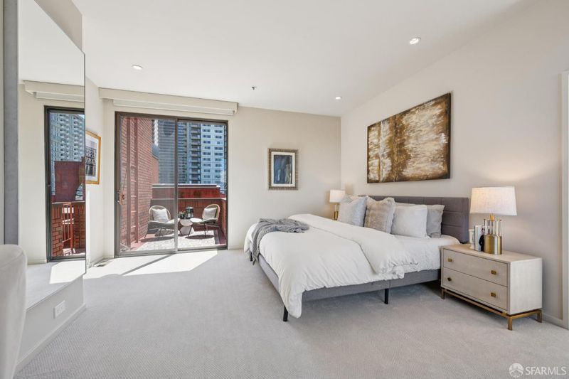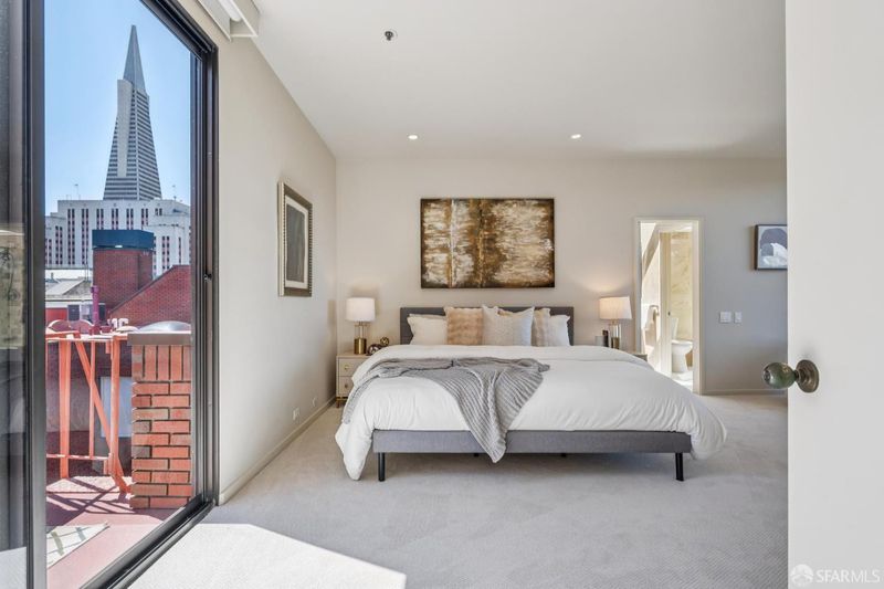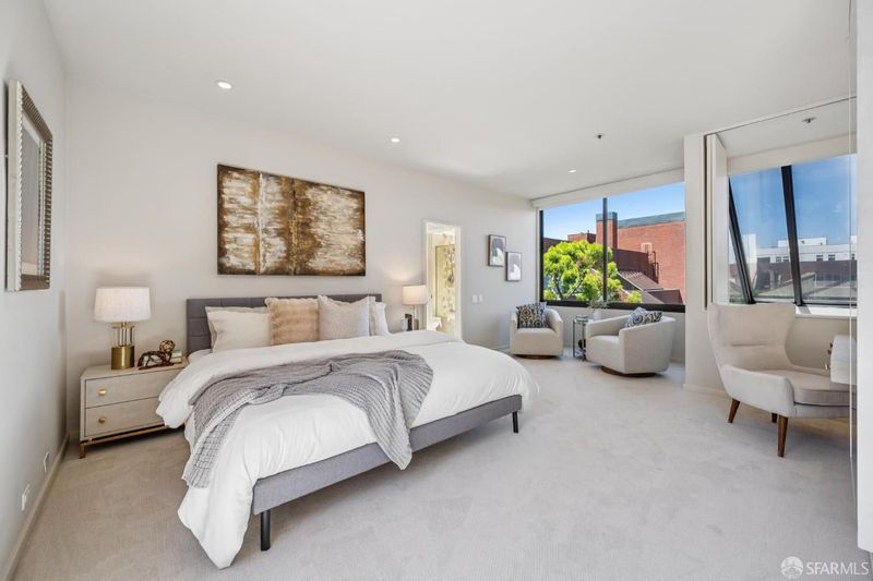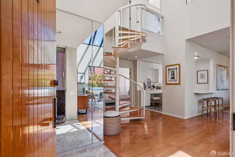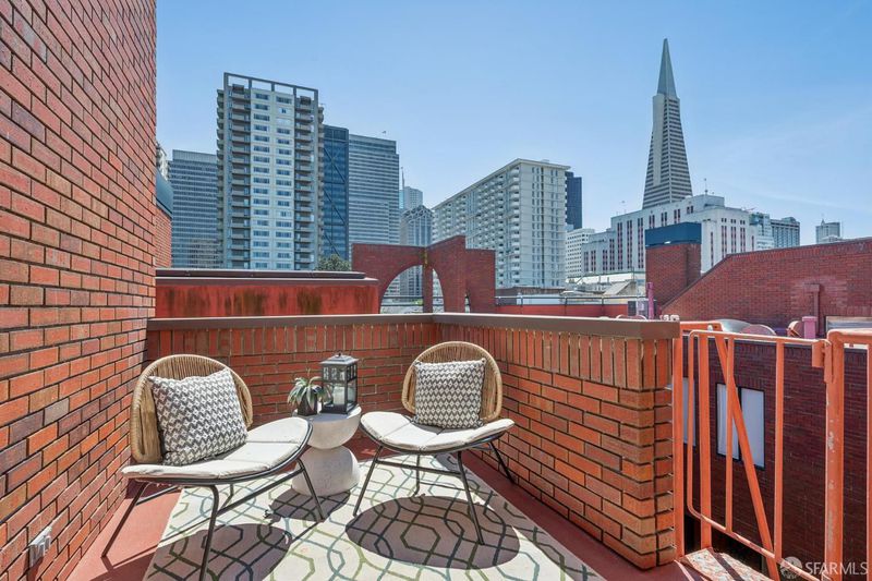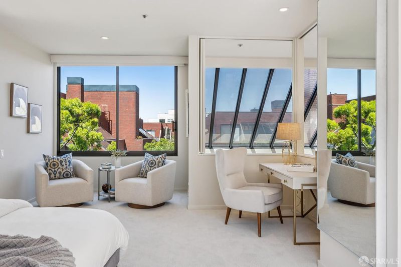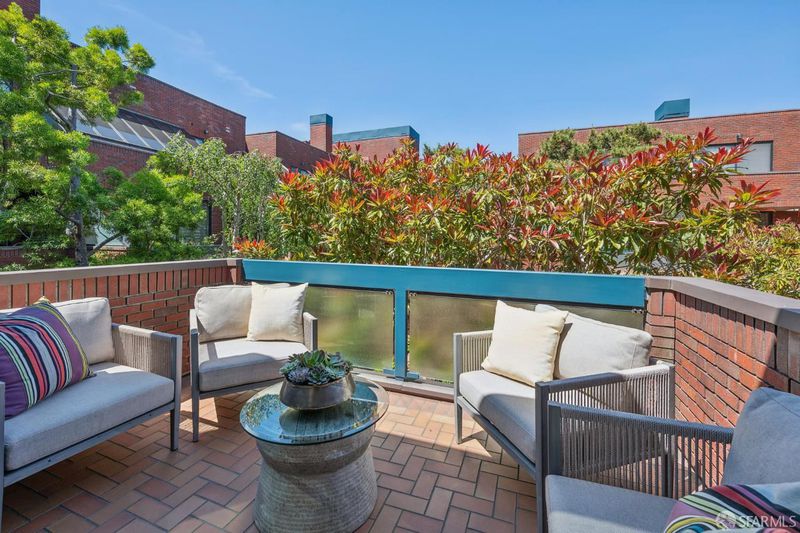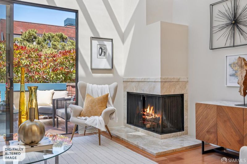 Modern, house-like condominium offering 1,993 square feet across two levels in the coveted Golden Gateway Commons. A tranquil courtyard setting provides a welcoming entry to the main level, anchored by a dramatic living room with 17-foot vaulted glass ceilings, wood-burning corner fireplace and sliding glass doors opening to a generous private deck. The open layout connects easily to the dining area and an updated Euro-style kitchen with marble countertops, wine chiller, and wet bar. A well-located bedroom, full bath with steam shower, and separate laundry room are also on this level, finished with hardwood and stone tile floors throughout. A contemporary spiral staircase leads to the upper level, where two en-suite bedrooms offer separation and privacy. The primary suite serves as a quiet retreat with a spa-like bath, walk-in closet, south-facing patio, and expansive windows overlooking the courtyard and living space below. A second en-suite bedroom completes the upper level and enjoys peaceful downtown outlooks. Well located near Kokkari Estiatorio, Bay Club San Francisco, Safeway, the Ferry Building Marketplace, the Embarcadero, Financial District, and Sydney G. Walton Square. One-car parking.