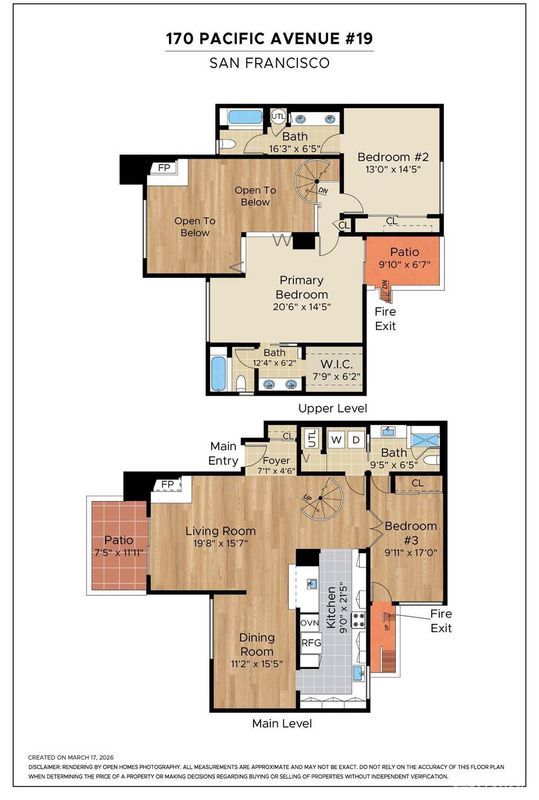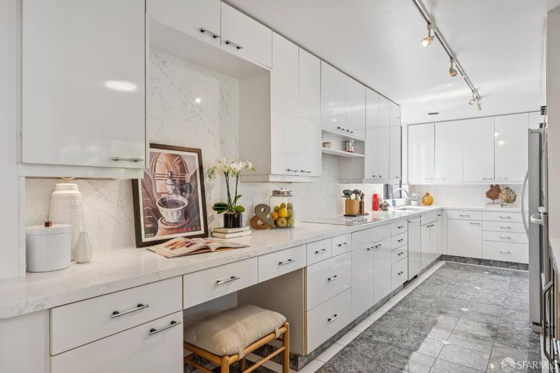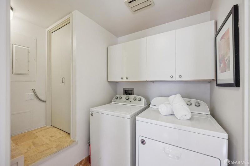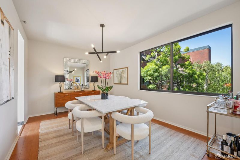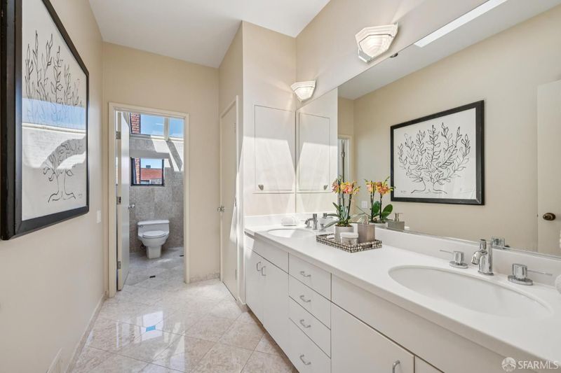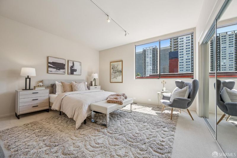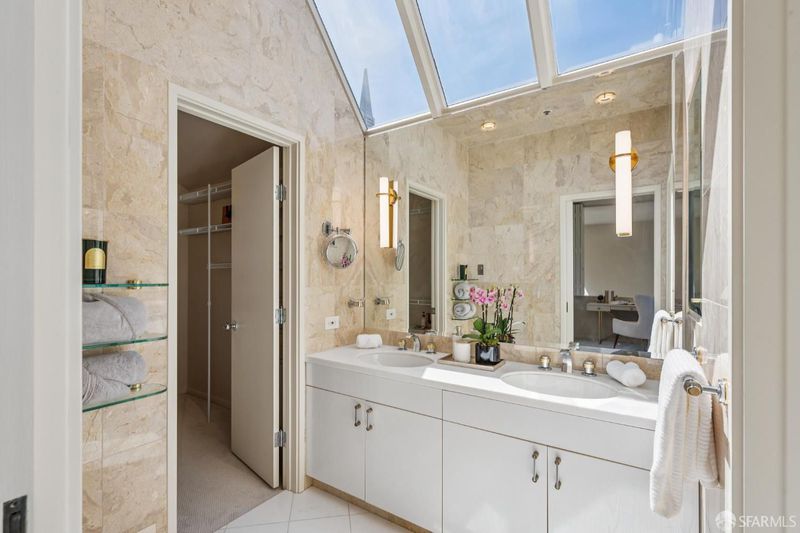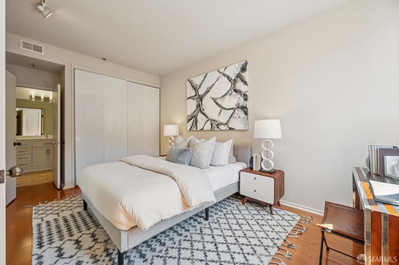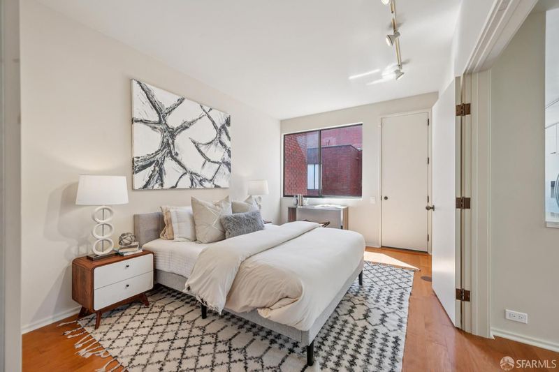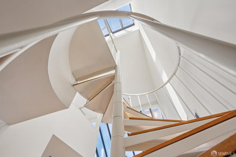 Modern, house-like condominium offering 1,993 square feet across two levels in the coveted Golden Gateway Commons. A tranquil courtyard setting provides a welcoming entry to the main level, anchored by a dramatic living room with 17-foot vaulted glass ceilings, wood-burning corner fireplace and sliding glass doors opening to a generous private deck. The open layout connects easily to the dining area and an updated Euro-style kitchen with marble countertops, wine chiller, and wet bar. A well-located bedroom, full bath with steam shower, and separate laundry room are also on this level, finished with hardwood and stone tile floors throughout. A contemporary spiral staircase leads to the upper level, where two en-suite bedrooms offer separation and privacy. The primary suite serves as a quiet retreat with a spa-like bath, walk-in closet, south-facing patio, and expansive windows overlooking the courtyard and living space below. A second en-suite bedroom completes the upper level and enjoys peaceful downtown outlooks. Well located near Kokkari Estiatorio, Bay Club San Francisco, Safeway, the Ferry Building Marketplace, the Embarcadero, Financial District, and Sydney G. Walton Square. One-car parking.
