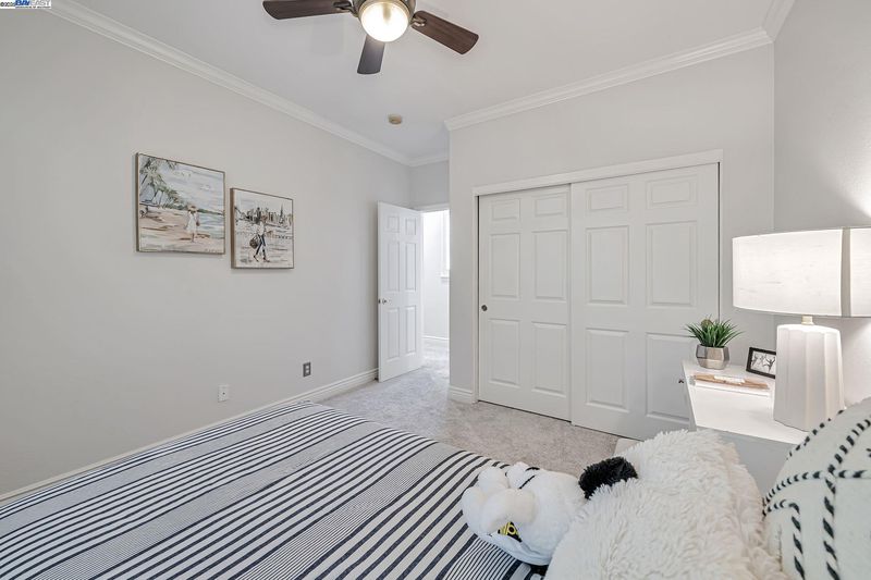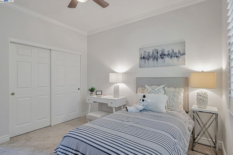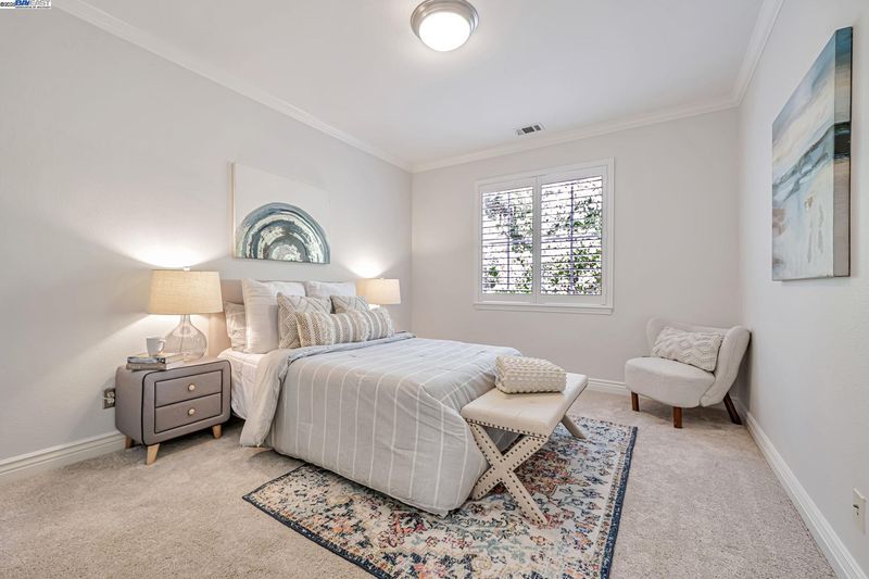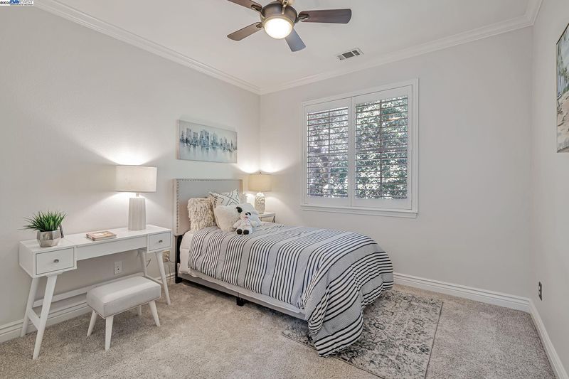 Elegant 3-bedroom, 2.5-bath home with a spacious loft (optional 4th bedroom) in desirable Quail Gardens. Situated on a private lot with no neighbors on two sides, it offers a serene backyard perfect for entertaining. Highlights include hardwood floors, crown molding, plantation shutters, and abundant natural light. The gourmet kitchen features stainless steel appliances, a gas cooktop, and a breakfast nook. The primary suite boasts a soaking tub, sitting area, and walk-in closet. Enjoy the community pool and close proximity to Blackhawk Plaza, parks, and top-rated San Ramon Valley schools.
