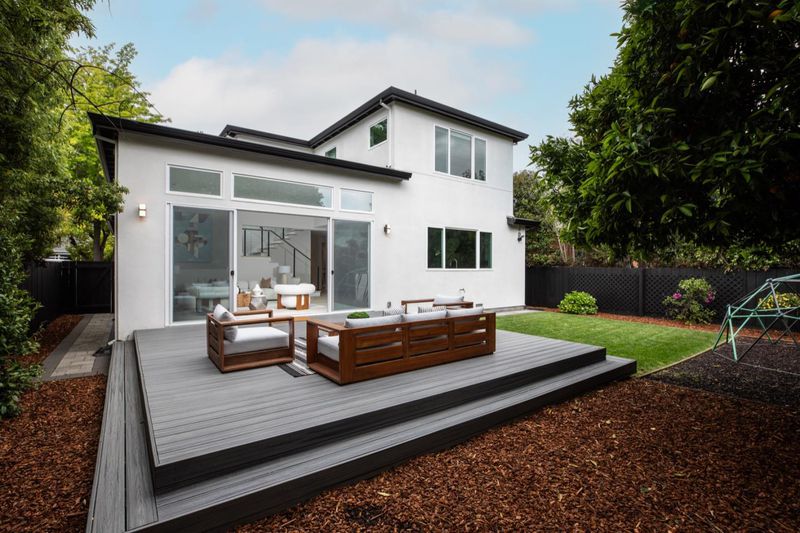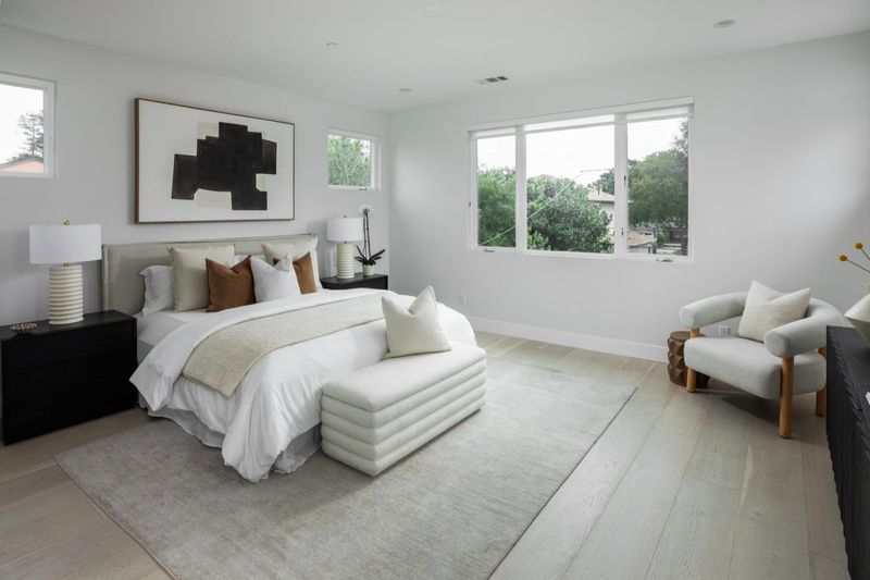 Located in the highly sought-after Flood Park neighborhood, this stunning home was completely rebuilt in 2021 with a focus on seamless indoor/outdoor California living and natural light. Designed by T-Square Architects, it features an off-white stucco exterior with ledge stone accents and steel-and-glass doors for striking curb appeal. Inside, light hardwood floors and wide hallways create an open, airy feel. The living room offers a floor-to-ceiling marble-style fireplace, while a main-level bedroom suite is ideal for guests or an office.The dining area flows into a spacious great room and chefs kitchen with Thermador stainless appliances, WiFi-enabled refrigerator and dishwasher, white lacquer cabinetry, and a waterfall-edge Cambria quartz island. The impressive family room boasts 12-foot ceilings, celestial windows, a fireplace, and glass doors opening to a private yard with Trex deck, lawn, and mature landscaping.Upstairs, the primary suite includes a luxurious bath with dual vanity, freestanding tub, and glass shower and private commode room. Additional features include Samsung washer and dryer, separate laundry room, tankless water heater, dual-zone HVAC, and proximity to parks, commute routes, and top Menlo Park schools.