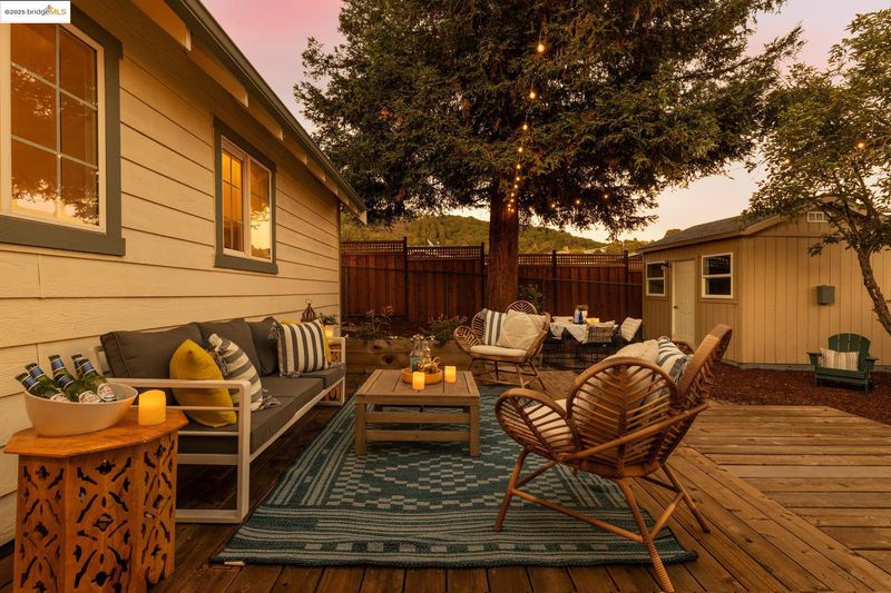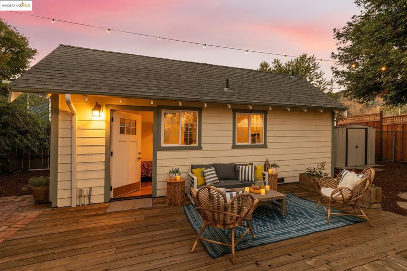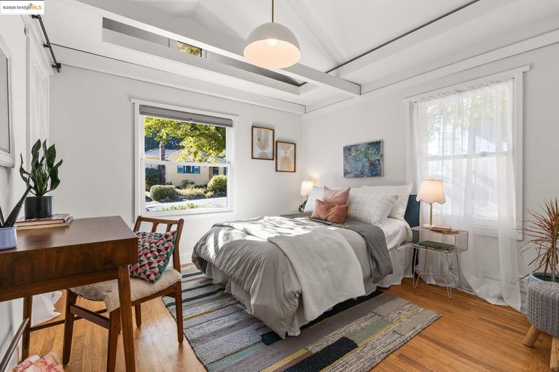 Welcome to this sunny California one-level bungalow with a fabulous detached guest house on an extraordinary lot. A lush front garden and welcoming porch set the tone for the bright interior of the main home, featuring exposed wood beam ceilings, hardwood floors, and fireplace. The dining area flows into a stylish kitchen with granite counters, gray and-off-white cabinetry, and a cozy breakfast nook with bay windows. Two comfortable bedrooms share a remodeled bath with subway tile and soaking tub. Convenient and spacious laundry room with workspace. Outside to find the detached one-level guest house with kitchenette and full bath; ideal for family, friends, or a home office. The oversized backyard boasts a patio & multiple gathering and play areas! Do not miss a semi-finished shed - which adds flexible space for a maker’s space or workshop. Long driveway for lots of off-street parking! EV charger, owned solar. Convenient to I-580, minutes to King Estate Open Space Park, Redwood Regional Park, Lake Chabot, and the Oakland Zoo. This is a special urban retreat!