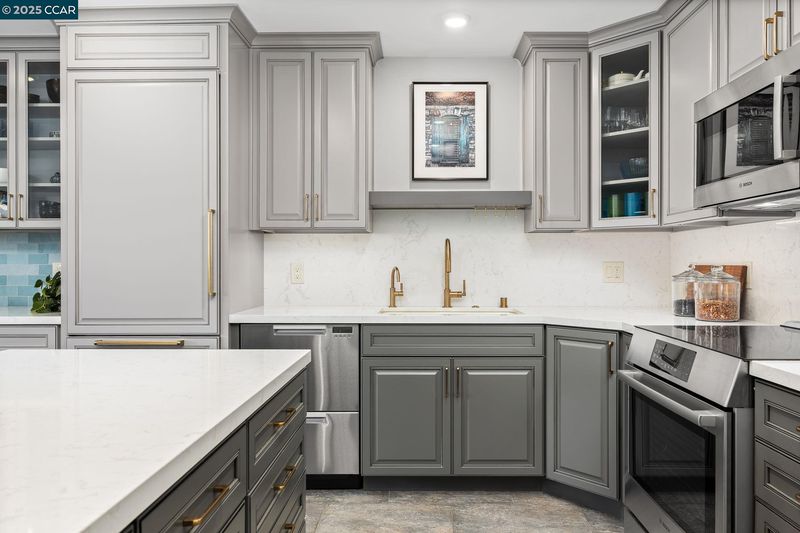Located in Rossmoor, Walnut Creek’s premier 55+ community, this beautifully renovated Sonoma model blends modern sophistication with serene, park-like surroundings. The open layout features smooth ceilings, hardwood floors, and abundant natural light through triple pane Pella windows and sliders that open to a balcony with peaceful views. The fully remodeled kitchen showcases all wood KraftMaid cabinetry, quartz countertops, a large island with bar seating, Brizo faucet, water filtration system, and premium appliances including a Bosch induction range, Fisher & Paykel two drawer dishwasher, and built in Thermador refrigerator. A custom buffet and Thomas O’Brien lighting enhance the dining area’s style. Both bedrooms include custom closet systems, and the updated bath features quartz countertops, modern cabinetry, and designer fixtures. Additional highlights include an LG washer and dryer, mirrored entry doors, and convenient carport parking. Residents enjoy a vibrant 55+ lifestyle with resort-style amenities including clubhouses, pools, fitness centers, walking trails, social events, and optional golf memberships, plus gated security and community transportation.