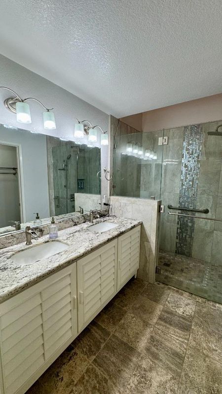 - Double Sinks, Granite, Shower and Tub, Tile, Updated Bath, Primary - Stall Shower(s)