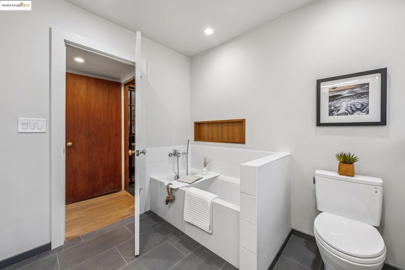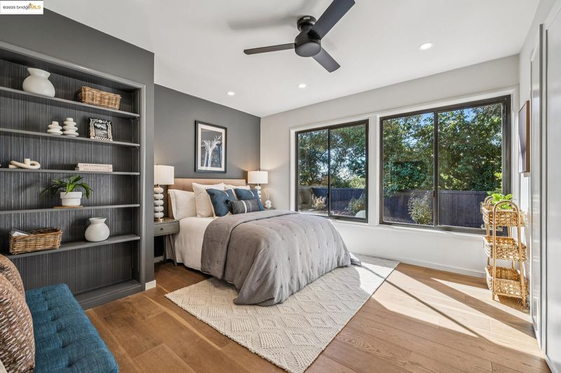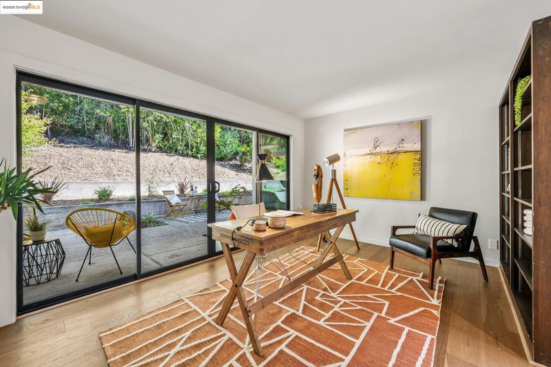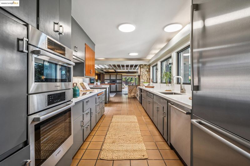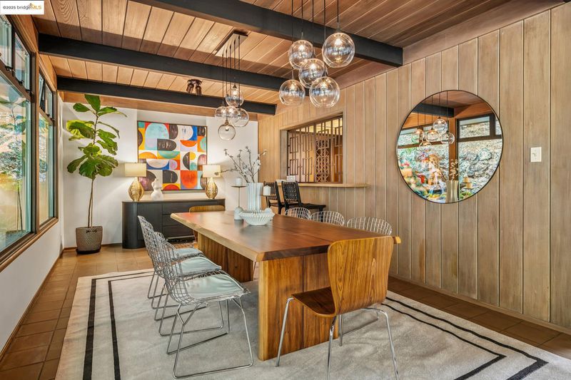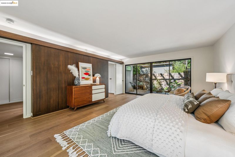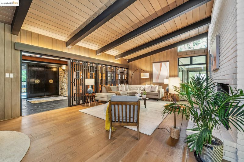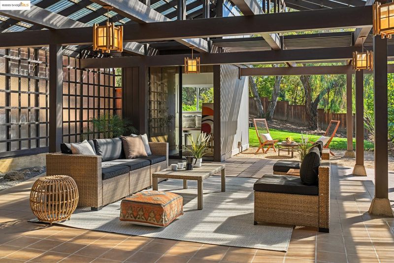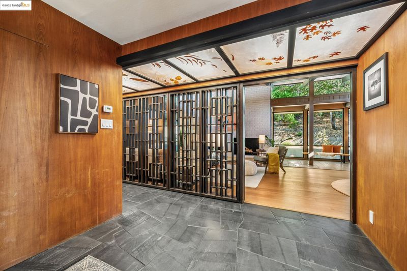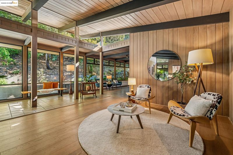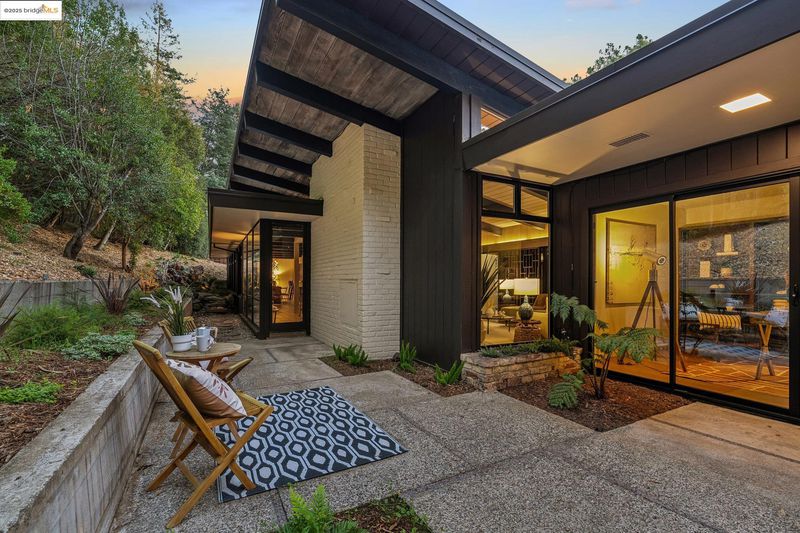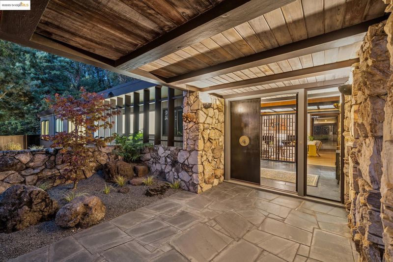 This one-of-a-kind estate captures the timeless spirit of mid-century modern architecture infused with Japanese design sensibility - clean lines, natural light, and harmony with nature. Walls of glass and wood paneling dissolve boundaries between indoors and out, framing tranquil views of the surrounding landscape; skylights fill the interiors with natural light. Distinct yet fluid living spaces include open living and dining areas and a lounge with a built-in bar and stereo cabinet opening to a spacious, covered patio for effortless indoor-outdoor living and entertaining. Stone-faced exterior walls extend seamlessly into the patio and lounge, blurring the line between structure and landscape. The kitchen gleams with quartz countertops and Bosch appliances, and the spa-like baths feature teak cabinetry and designer fixtures. The primary suite opens to a private garden and a sunlit patio. Set on a quiet cul-de-sac near regional parks, this is a home of timeless elegance.