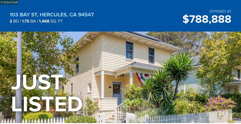 Located in the Historic Village of homes nestled in Hercules, CA, near the scenic shores of San Pablo Bay, 103 Bay Street offers a rare opportunity to own a true piece of local history. Built in 1900, this timeless Colonial Revival is one of just 21 original Victorian-era homes still on display in this charming enclave. It sits on a premium 5,742 sq ft corner lot with beautiful water views — blending classic architecture with thoughtful modern upgrades. From the moment you arrive, the inviting front porch — perfect for rocking chairs or a garden retreat — welcomes you in, framed by a charming white picket fence. Inside, the home’s historic character shines through hardwood floors, detailed trim work, crown molding, and a graceful stairway banister leading to the second floor. The cozy yet functional layout features two generously sized bedrooms, one and a half baths, and warm living spaces ideal for both everyday comfort and entertaining. Modern enhancements include dual-pane windows, a newer roof, owned solar, a tankless water heater, and inside laundry for added convenience. The kitchen has been refreshed with newer appliances, offering a seamless blend of charm and practicality. Step outside to what may be the home’s most captivating feature — a newly constructed view deck.